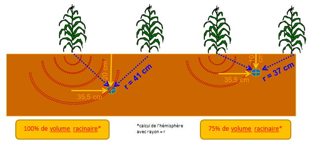 Figure 1 : sur maïs, en plaçant le dépôt d’engrais 1 interrang sur 2, à une profondeur de 20cm, la plante développe environ 25% de volume racinaire supplémentaire par rapport à une injection à 10cm.